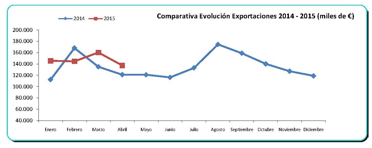En el acumulado del primer cuatrimestre del año, la provincia ha exportado por valor de 587 millones de euros, 51,5 millones más que en el mismo periodo del año anterior. Tal y como se muestra en la siguiente gráfica, cada mes se ha exportado más que en mismo mes de 2014, excepto en febrero.