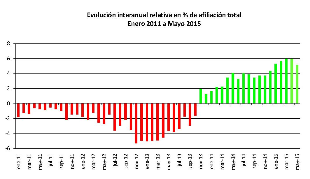 En lo que llevamos de 2015, en total la provincia cuenta con 30.463 afiliados más. Este incremento se suma a los que se vienen produciendo desde noviembre de 2013 cuando los datos de afiliación cambiaron de signo y comenzaron a experimentar un incremento sostenido hasta la fecha. Cada uno de los meses han tenido más afiliados que el mismo mes del año anterior, siempre teniendo en cuenta la media mensual. Esta afirmación se puede ver con claridad en la gráfica que se adjunta a continuación: