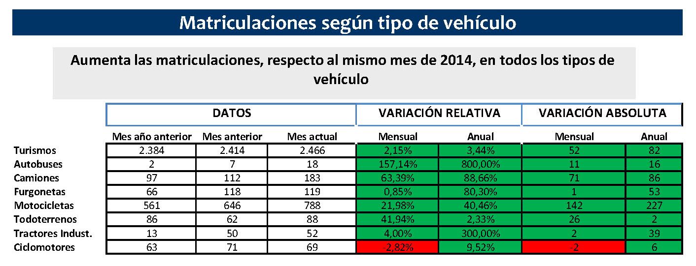 En lo que llevamos de año, el total de vehículos matriculados asciende a 17.047, lo que supone 3.917 más que el mismo periodo de 2014. En la ficha estadística que ha elaborado el Observatorio Socioeconómico de la Fundación se puede observar con claridad la evolución de matriculaciones y su comparación con los meses del año pasado, así como el resto de datos al detalle.